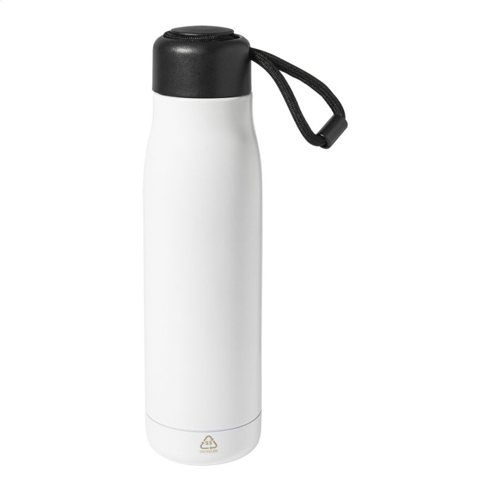 Dvojstenná, vákuovo izolovaná fľaša z recyklovanej nerezovej ocele s PP viečkom a integrovaným pútkom na nosenie so šnúrkou. 500 ml.
