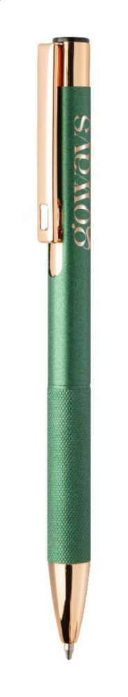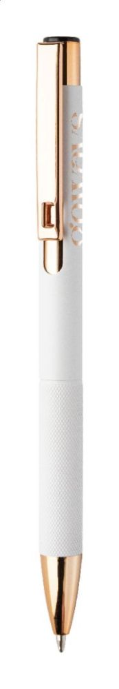Guľôčkové pero z recyklovaného hliníka s matným telom, textúrovaným úchopom a detailmi ružového zlata. So špeciálnym povrchom na zrkadlové laserové gravírovanie vo farbe ružového zlata. S modrou náplňou.