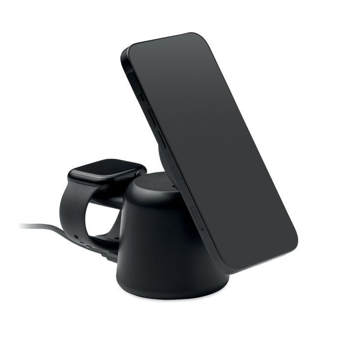 Nabíjecí stanice 3v1 z ABS plastu. Součástí je 15W magnetická bezdrátová nabíječka pro telefon a TWS s funkcí držáku a nabíječka pro chytré hodinky (pouze pro iOS). Magnetická funkce kompatibilní s iPhone® 12 a novějšími. Včetně přídavného magnetického kovového kroužku.