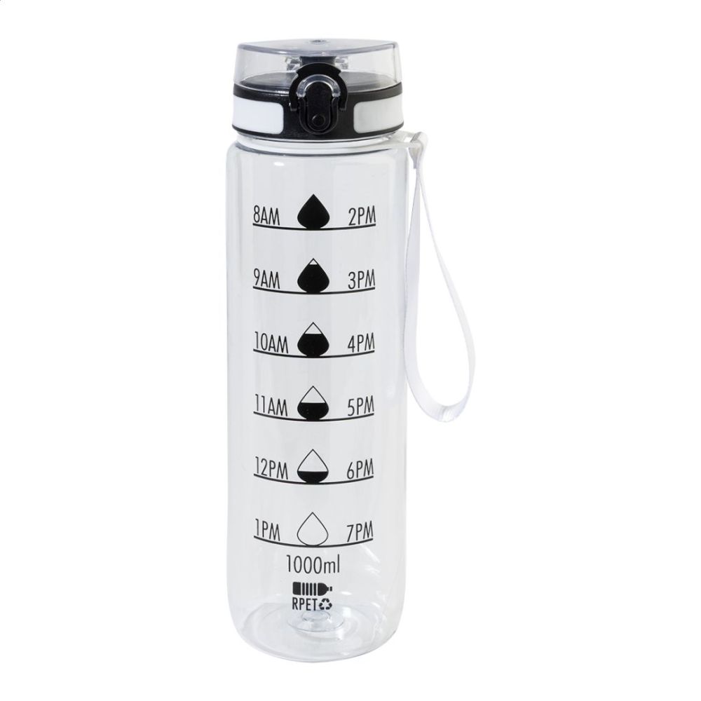 Športová fľaša z matného RPET s motivačným objemovým a časovým značením, s automaticky otvárateľným odklápacím viečkom s bezpečnostným zámkom a pútkom na nosenie. 1000 ml. Bez BPA. Nevhodné pre sýtené nápoje.