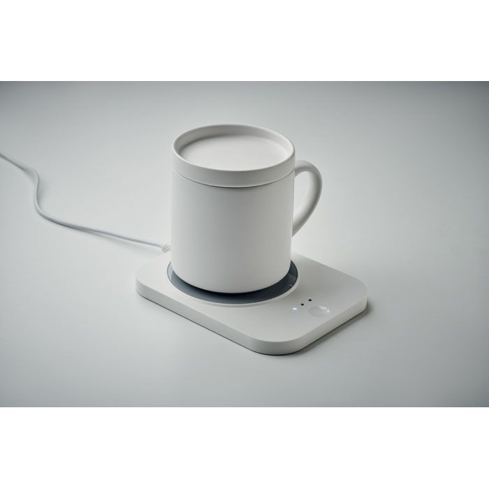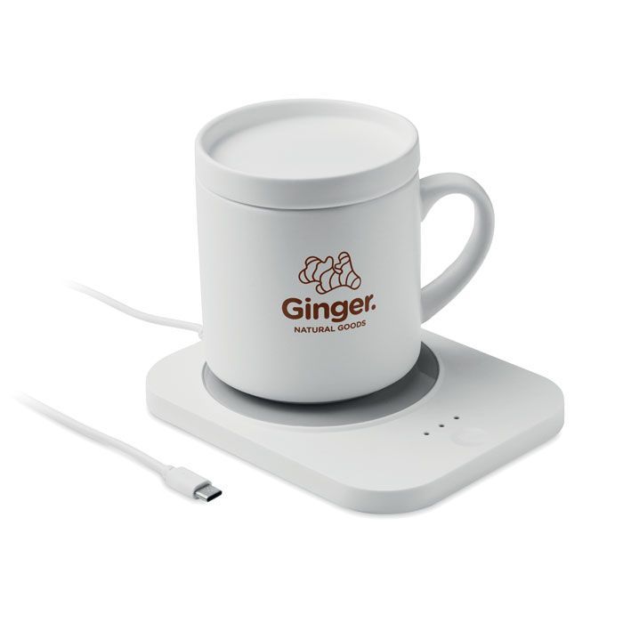Bezdrátová 15W ABS nabíječka 2v1 a ohřívač hrnků. S keramickým hrnkem s víčkem. Objem 250 ml. Udržujte nápoje teplé na max. 50ºC. Tři nastavení teploty s dotykovou obrazovkou. Propojovací kabel USB. Výstup: DC 9V/1.67A (15W).