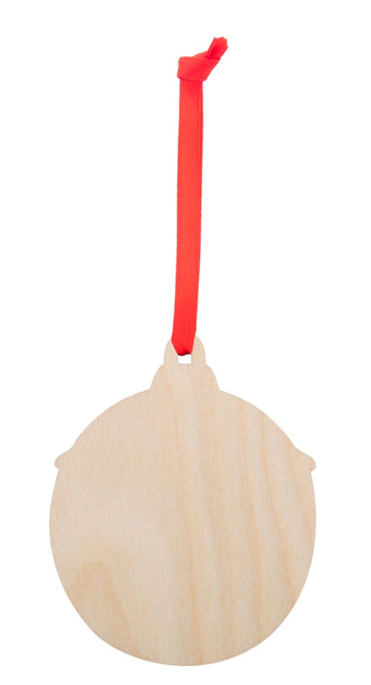 Vianočná ozdoba z brezovej preglejky s potlačeným vianočným vzorom a červenou stuhou, ktorá sa dodáva samostatne.