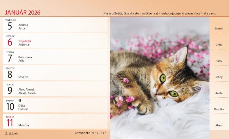 Tento stolový riadkový kalendár vám každý týždeň prinesie fotografiu mačiek, zachytených v rôznych pózach, doplnený o mačacie mená a výstižné mačacie citáty. Či už ide o ladné domáce mačky, zvedavé mačiatka alebo elegantné plemená, každý týždeň ponúka nový pohľad do sveta týchto charizmatických zvierat.