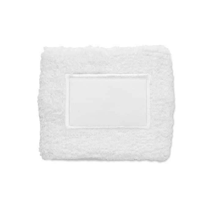 Potítko na zápěstí z polybavlny (79% bavlna, 13 % elastan, 8 % polyester) s bavlněnou nášivkou pro potisk.
