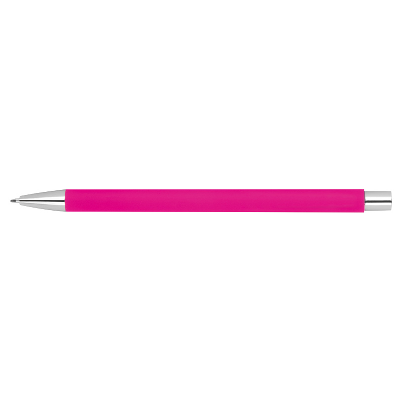 Tenké plastové stláčacie guľôčkové pero so striebornými aplikáciami a modrou náplňou.