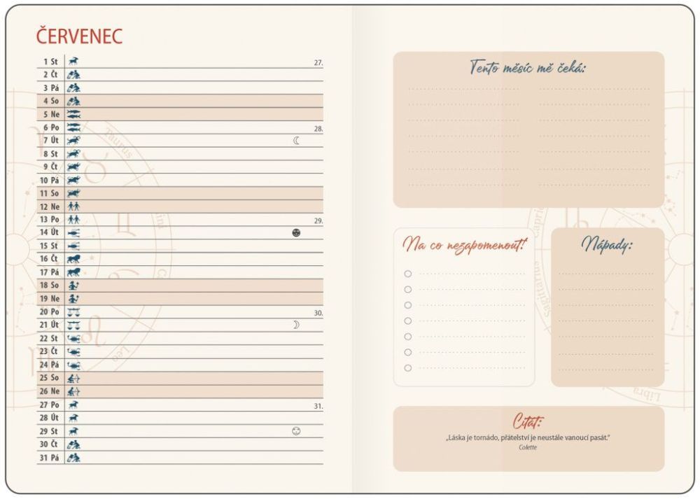Diář orientovaný na praktické rady, podle kterých se můžete řídit během lunárního cyklu a s informacemi týkajícími se péče o tělo, domácnost, kutilství a zahradu. Desky jsou vyrobeny z matného lamina s oblíbeným hedvábným povrchem soft touch. Diáře jsou doplněny gumičkou přes hřbet, záložkou a třemi aršíky kreativních samolepek.