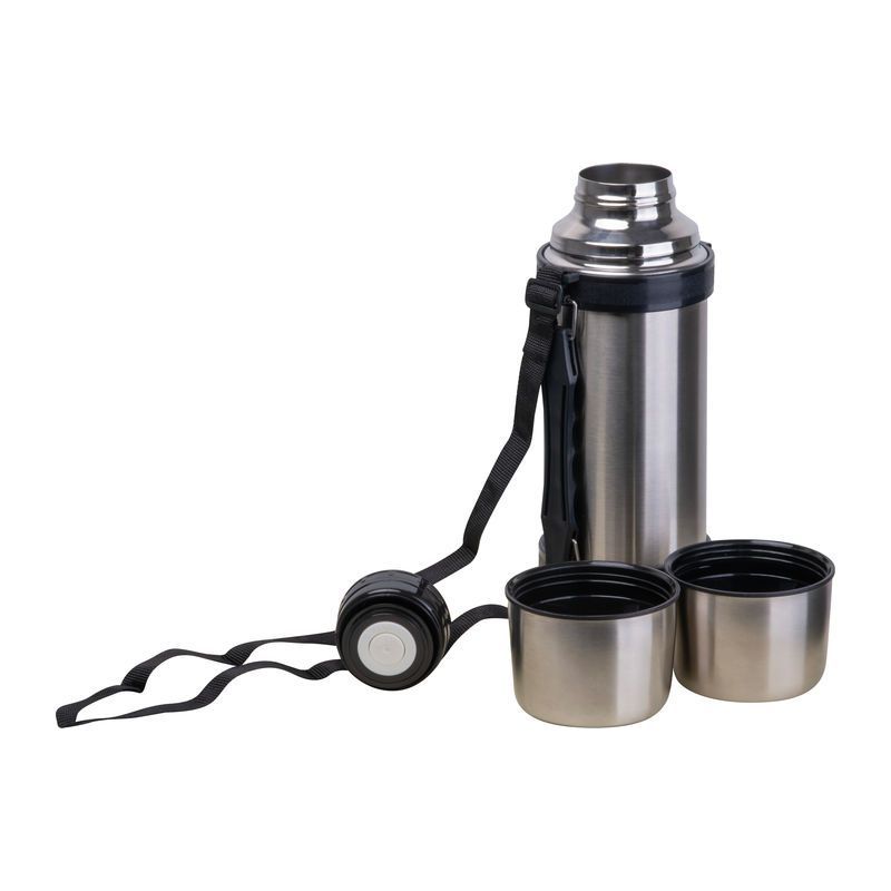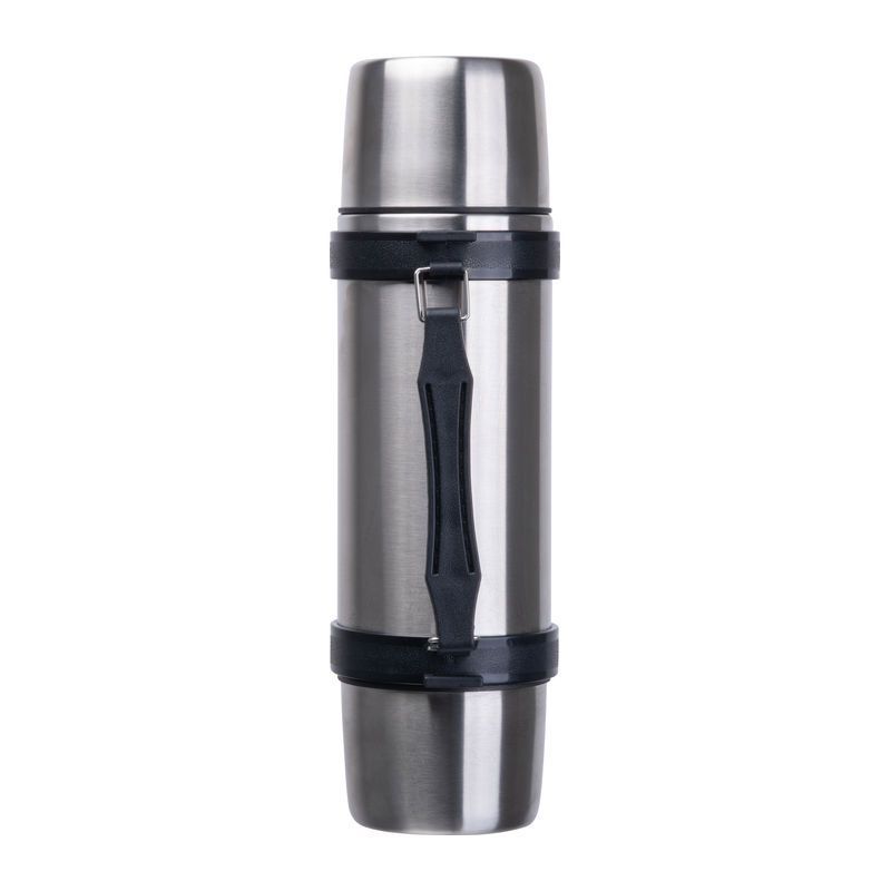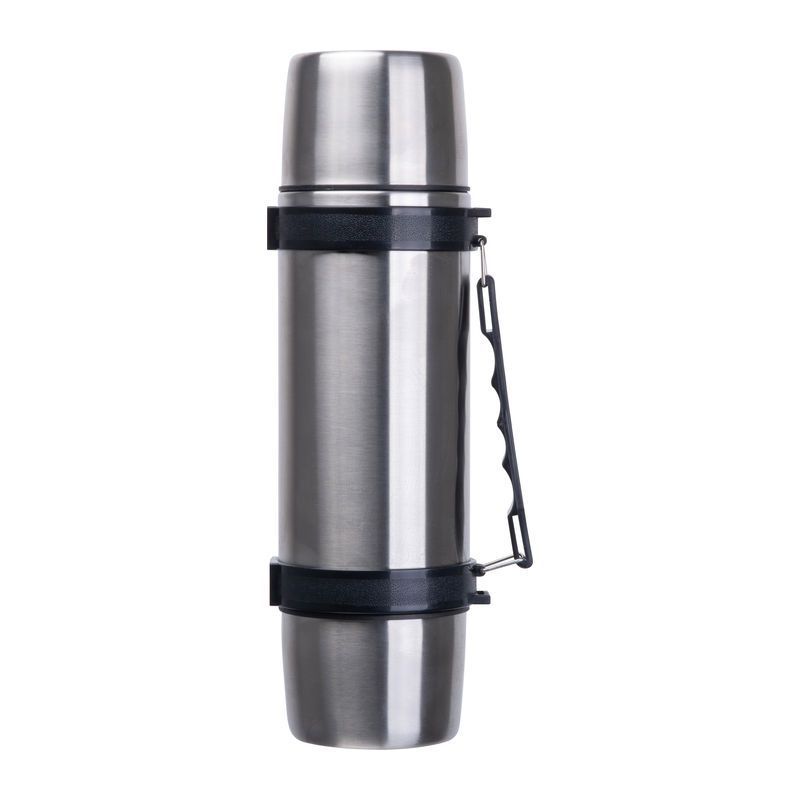 Robustná vákuovo izolovaná nerezová termoska 1000 ml s popruhom a dvoma integrovanými pohármi, ideálna na cestovanie.