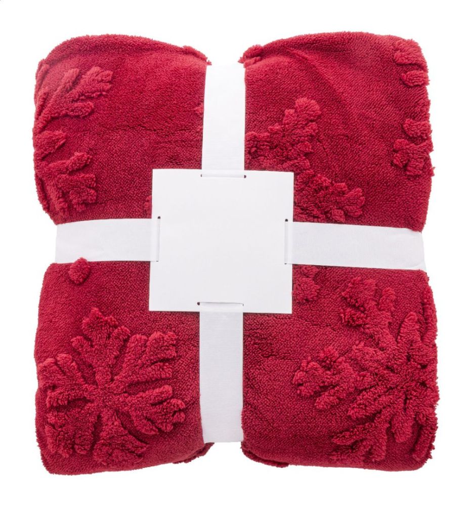 Luxusná dvojvrstvová vianočná deka z RPET s žakárovým vzorom snehových vločiek. S koralovým fleecovým materiálom RPET 260 g/m² a obojstrannou podšívkou z RPET sherpa fleecu 210 g/m². Zabalené do stuhy a tlačiteľného papierového kartónu.