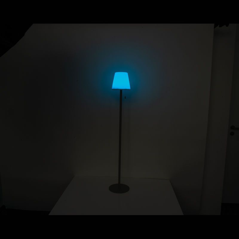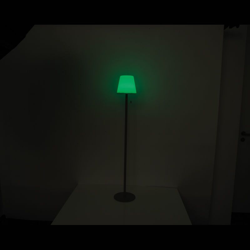 Veľká vonkajšia lampa so zmenou farby a štýlovým dizajnom, Ø 19 × 105 cm, doba svietenia 8–10 hodín, 3,7 V, 2 × dobíjateľné batérie 1 200 mAh, tienidlo PP, kovová základňa. Ideálna do vonkajších priestorov na vytvorenie útulnej a farebnej svetelnej atmosféry.