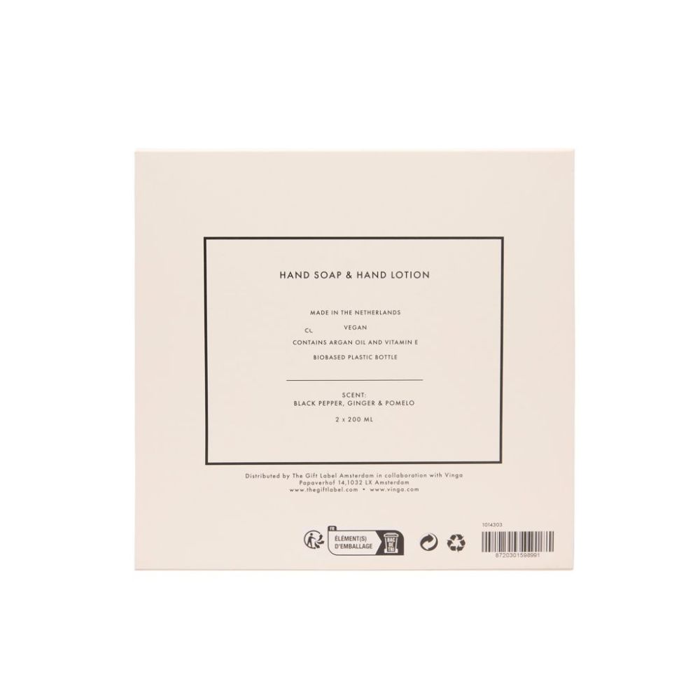 Hebké ruky každý deň. Doprajte si starostlivosť o ruky s touto krásne voňavou unisex sadou, ktorá obsahuje dve 200 ml fľaštičky tekutého mydla a krému na ruky. Vôňa čierneho korenia, zázvoru a pomela zanechá vaše ruky jemné, vyživené a príjemne prevoňané. Dotyk, na ktorý sa nezabúda. Elegantne balené v darčekovej krabičke v krémovo-bielej a čiernej farbe.