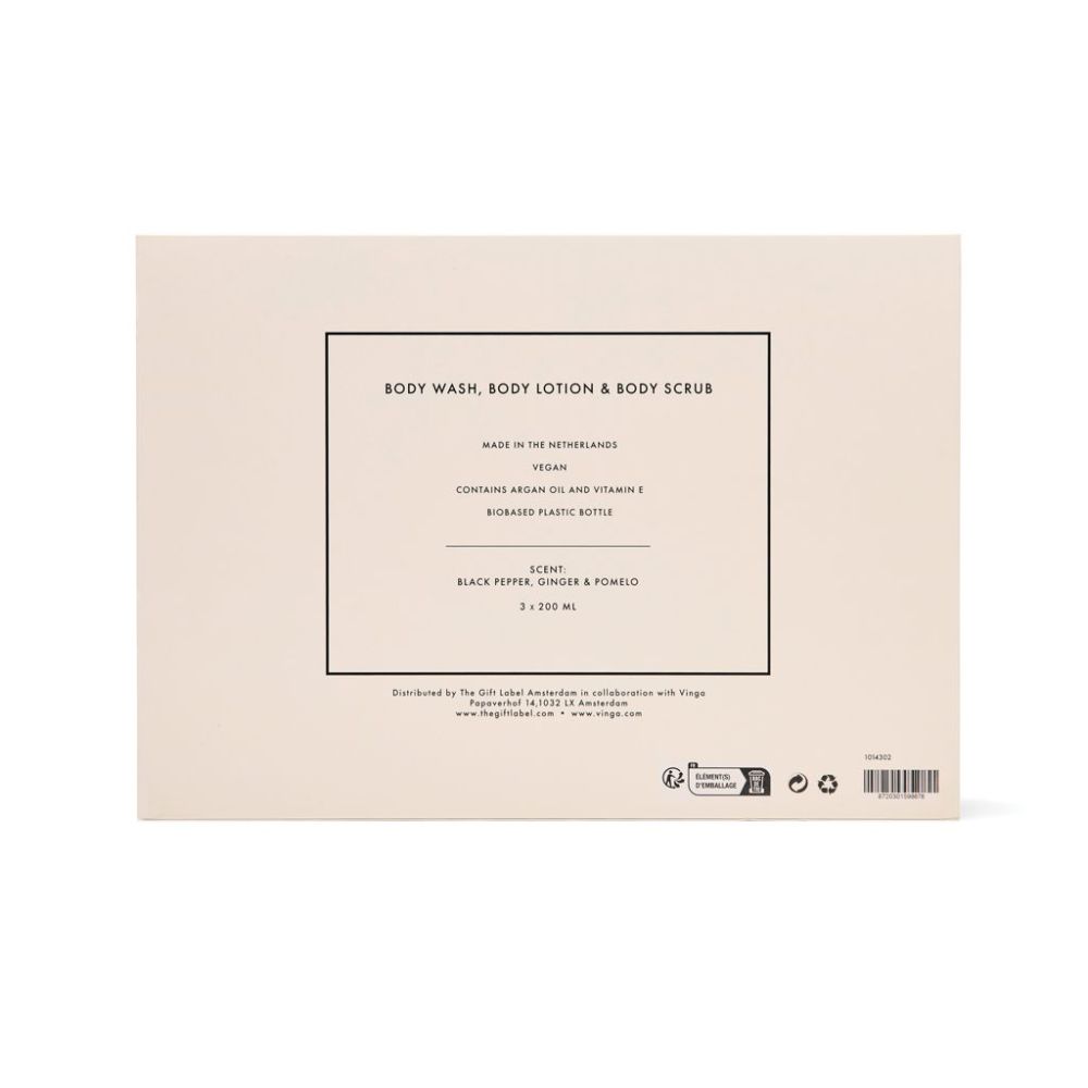 Premeňte každé sprchovanie alebo kúpeľ na luxusný rituál. Táto unisex trojdielna sada obsahuje 200 ml tuby sprchového gélu, telového peelingu a telového mlieka, ktoré vyživujú pokožku od hlavy po päty. S hrejivou a sviežou vôňou čierneho korenia, zázvoru a pomela zanechá pokožku jemnú, sviežu a príjemne prevoňanú. Elegantne balené v darčekovej krabičke v krémovo-bielej a čiernej farbe.