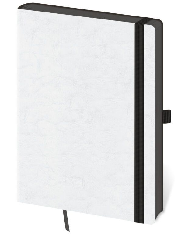 Na nerozoznanie od skutočnej kože, navyše doplnený gumičkou cez chrbát a oriezkou bloku v čiernej farbe. Ďalšími doplnkami sú papierová kapsička na vnútornej strane zadných dosiek a pútko na ceruzku.